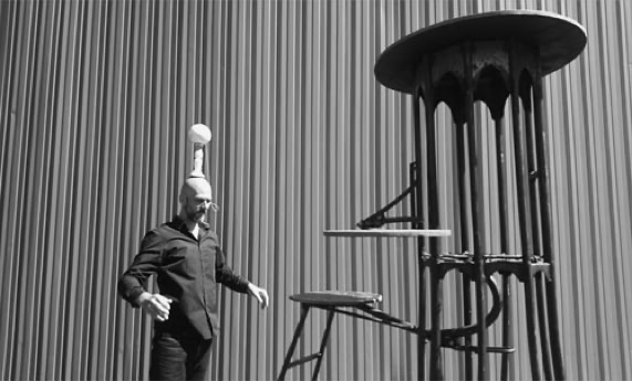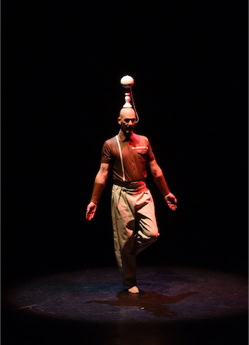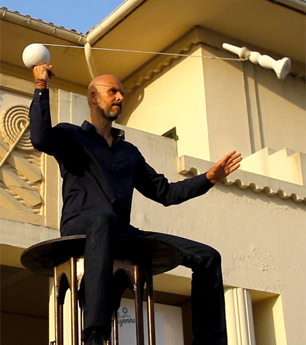 Une boule d'un blanc laiteux, suspendue à la nuit par un fil, glisse jusqu'à la main d'un jongleur qui, à son contact, découvre le toucher, la sensation, la beauté intrinsèque et pure des choses. La grâce et la légèreté puisent leur énergie dans la transcendance des arts martiaux. Peu à peu l'artiste maîtrise son univers, un bilboquet, mappemonde qu'avec dextérité il invite à danser.
